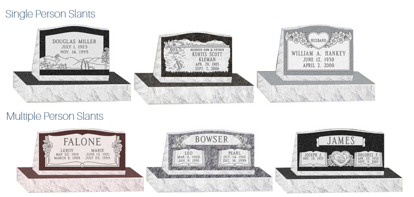 We have a selection book we would be happy to go through with you at your convenience, either in your home or by appointment at the funeral home 724-224-7730. In the meantime, so that you can be better prepared, we have selected representative markers, slants, and monuments we have obtained through our local vendor.